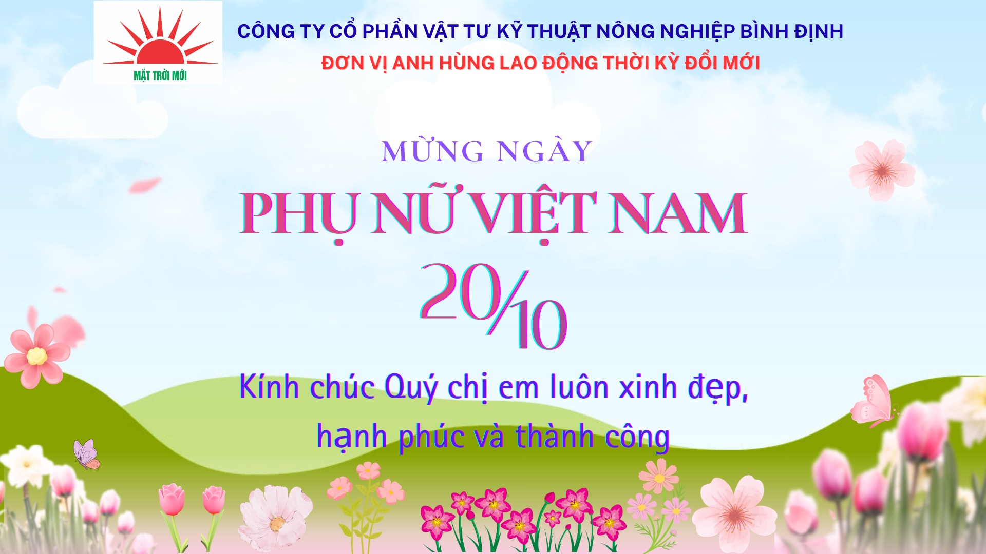 Nhân dịp Ngày Phụ nữ Việt Nam 20/10, Công ty Cổ phần Vật tư Kỹ thuật Nông nghiệp Bình Định – Đơn vị Anh hùng Lao động thời kỳ đổi mới, xin trân trọng gửi đến toàn thể Quý chị em phụ nữ lời chúc sức khỏe, hạnh phúc và thành công.
